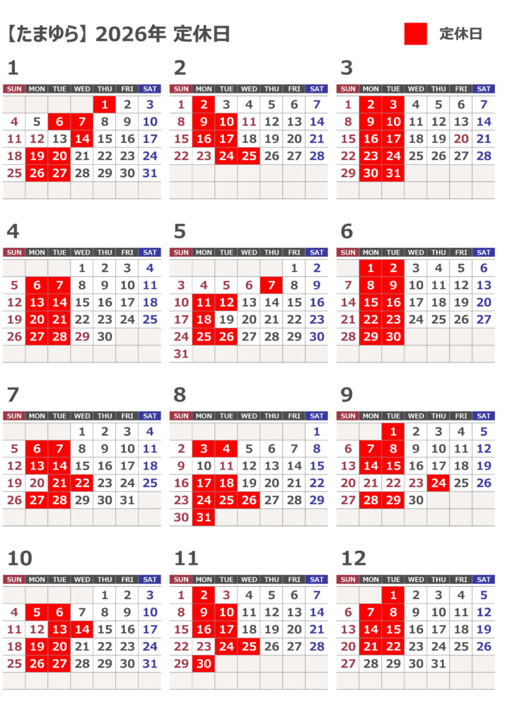 | 定休日 | 毎週月・火曜日 その他は下記のカレンダーにてご確認下さい 。 |