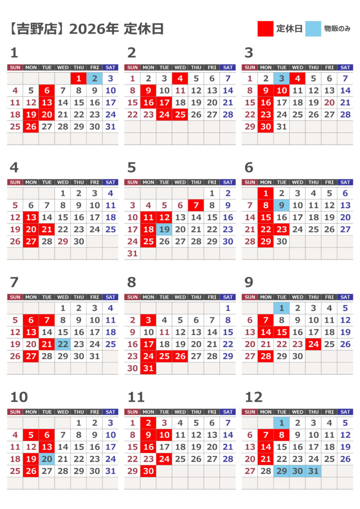 | 定休日 | 毎週月曜日 その他は下記のカレンダーにてご確認下さい 。 赤が定休日・青が物販のみ営業となります。 |
